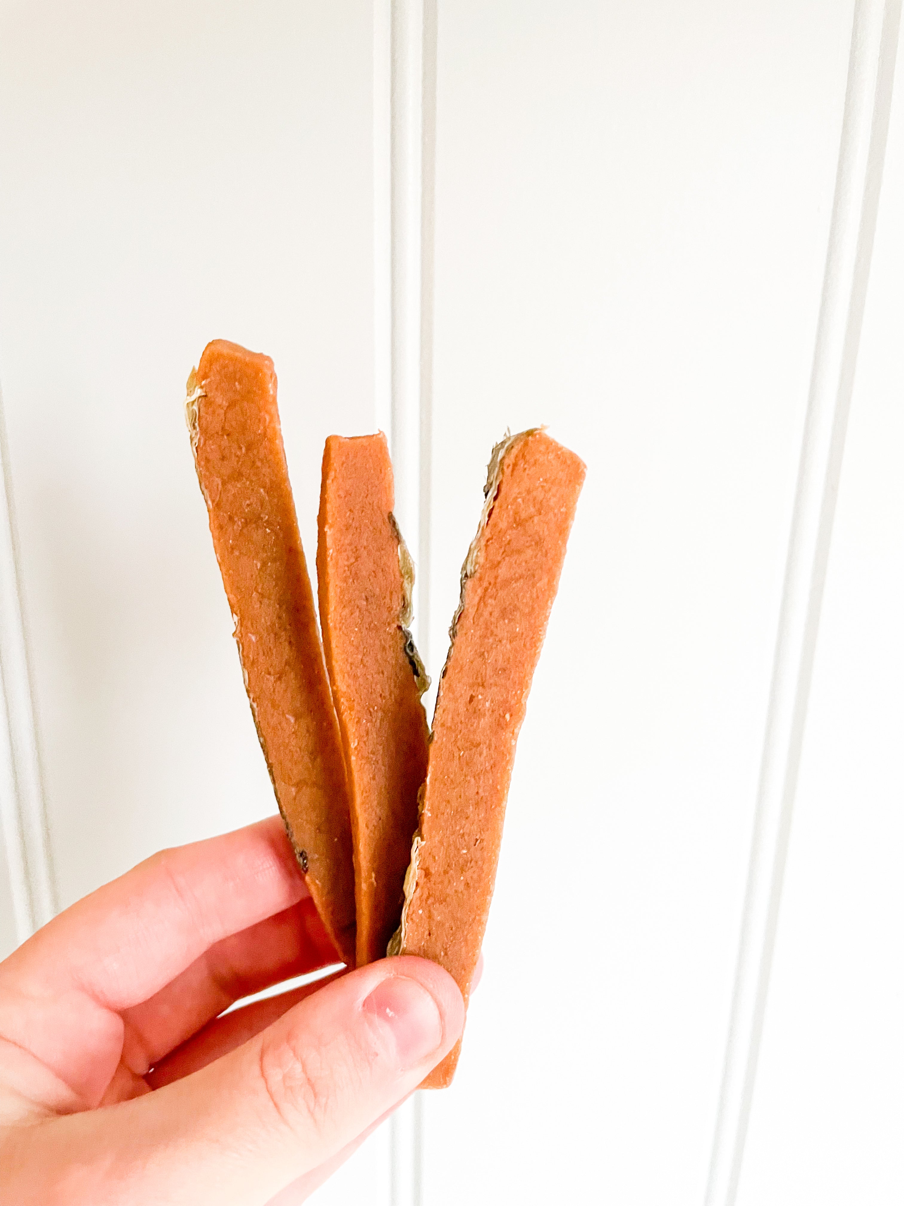 The Chewy Salmon Strips are made from a mix of salmon paste and salmon skin making them a delicious chewy snack.