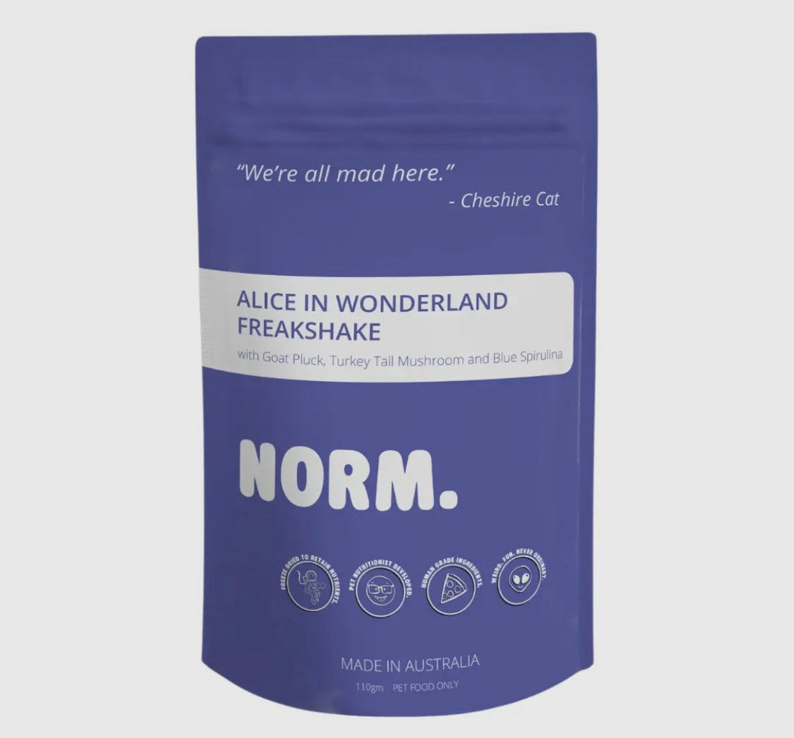 - ALICE IN WONDERLAND 110G : This is made from freeze dried goat pluck, turkey tail mushrooms, blue spirulina and coconut milk powder.