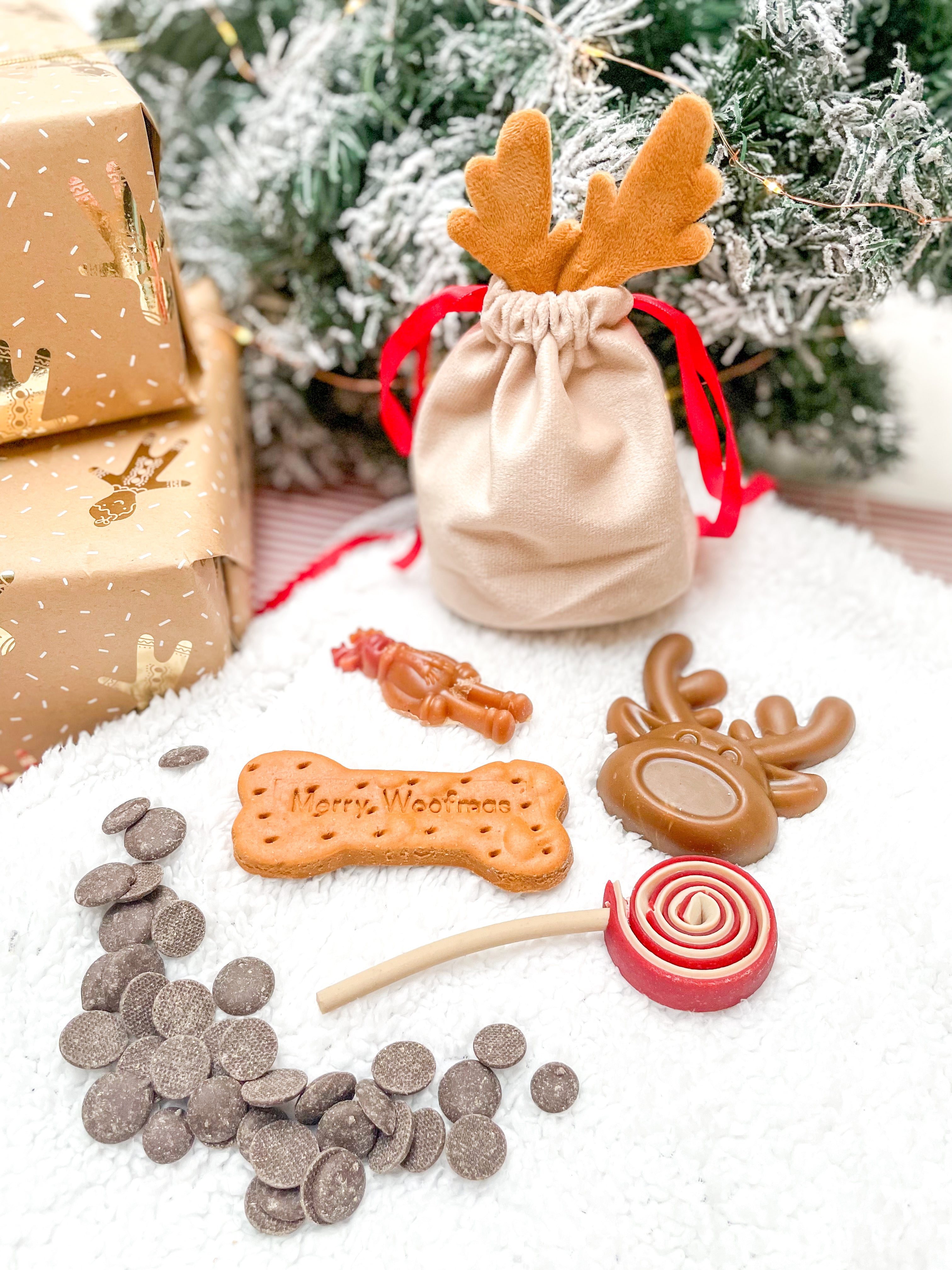 These luxe velvet antler bags contain a variety of reindeer themed treats and can be reused when you’ve eaten them all! Perfect as a gift or to treat yourself this Woofmas.
