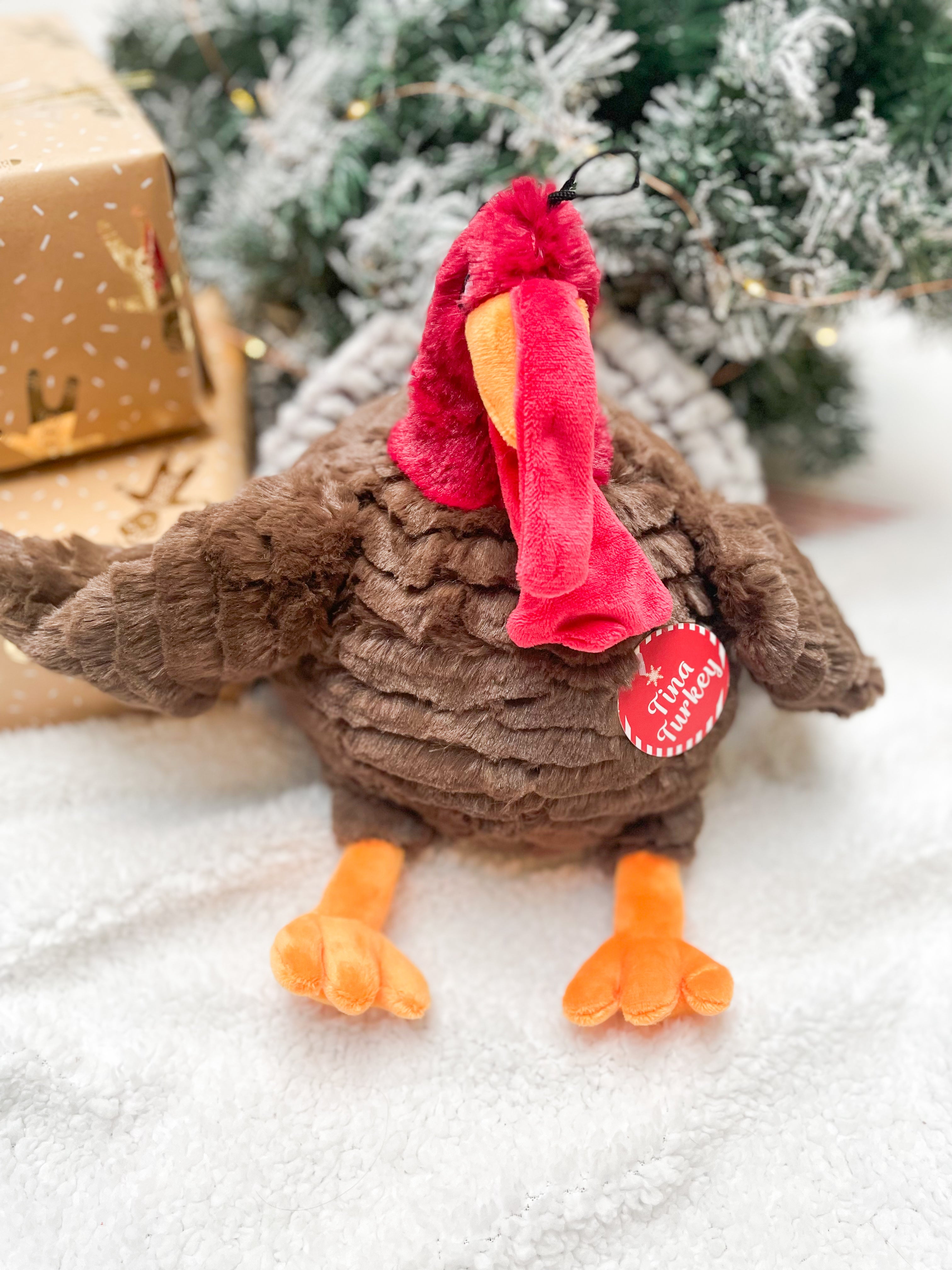 Tina Turkey is the ultimate festive toy! With a soft plushie body, crinkly tail and squeaker, she is a christmas must have!